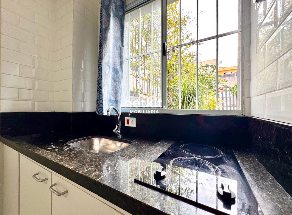 - Cozinha com pia em pedra, armário e fogão elétrico de 2 bocas